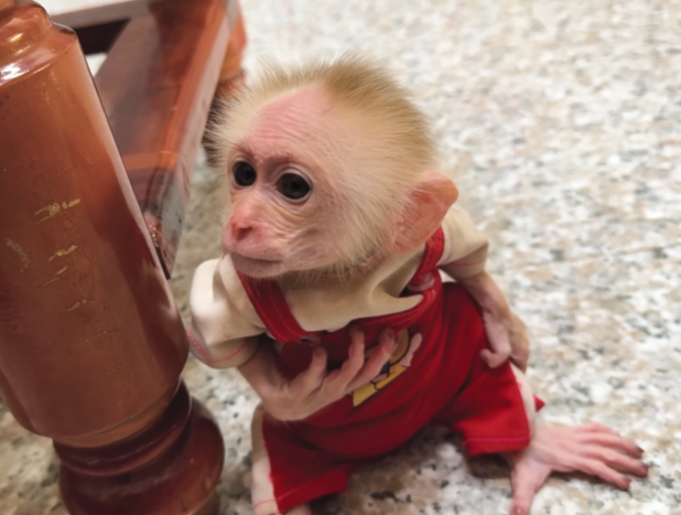 Baby Monkey climbed onto the counter and grabbed… a banana. Of course. He peeled it and tried to put it on a plate.