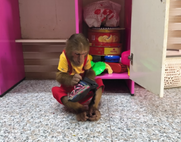 CUTIS began folding neatly. Baby Monkey watched closely, then grabbed a shirt and copied him… badly. He twisted it, rolled it, squished it, then proudly placed it in the “finished pile.”