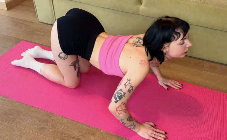 Her hands pressed firmly into the floor as she swayed gently forward and back—micro-movements designed to tease open every tight corner inside her hips.