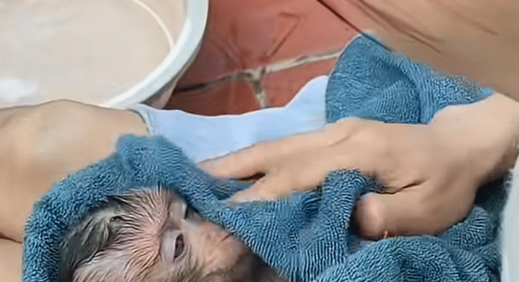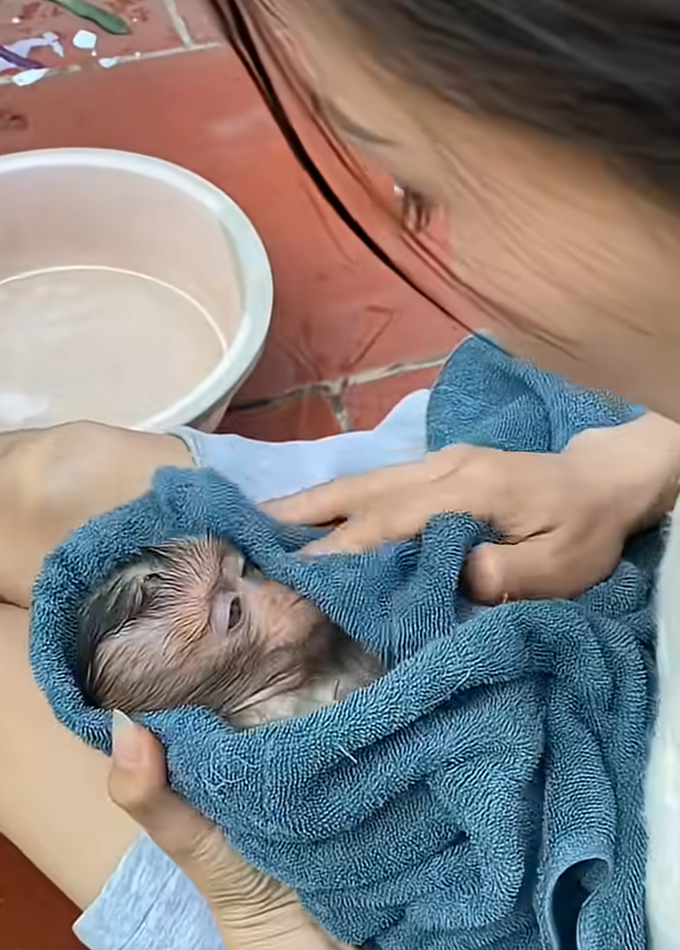 Baby monkey Susu is very good. His mother is bathing him. 😙