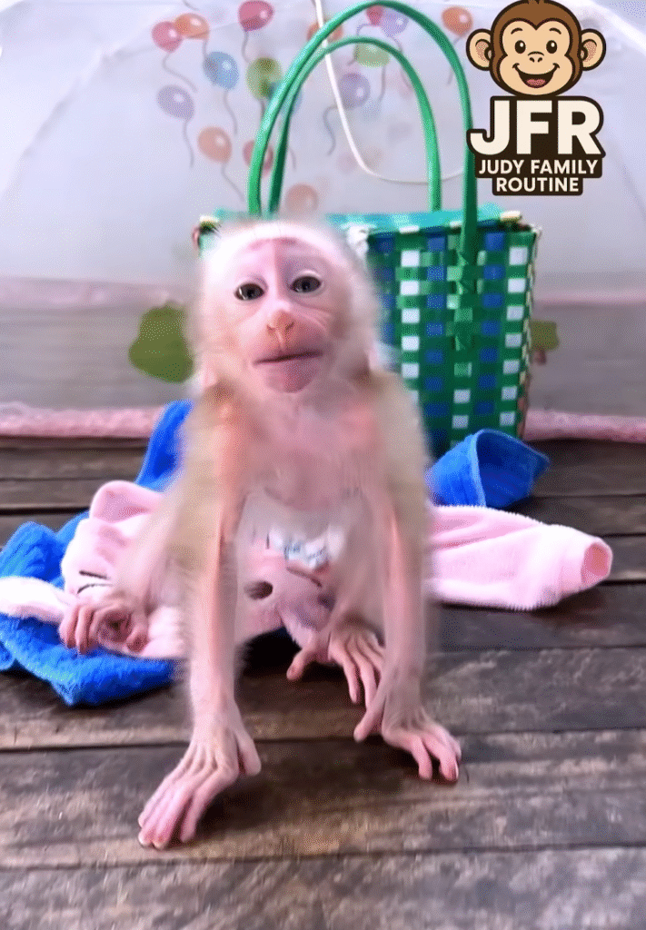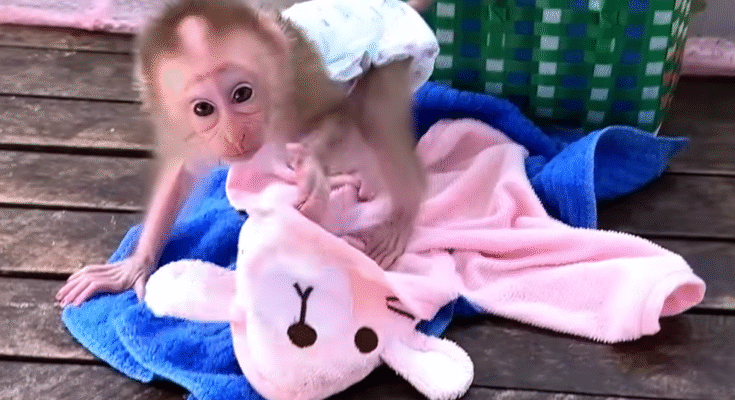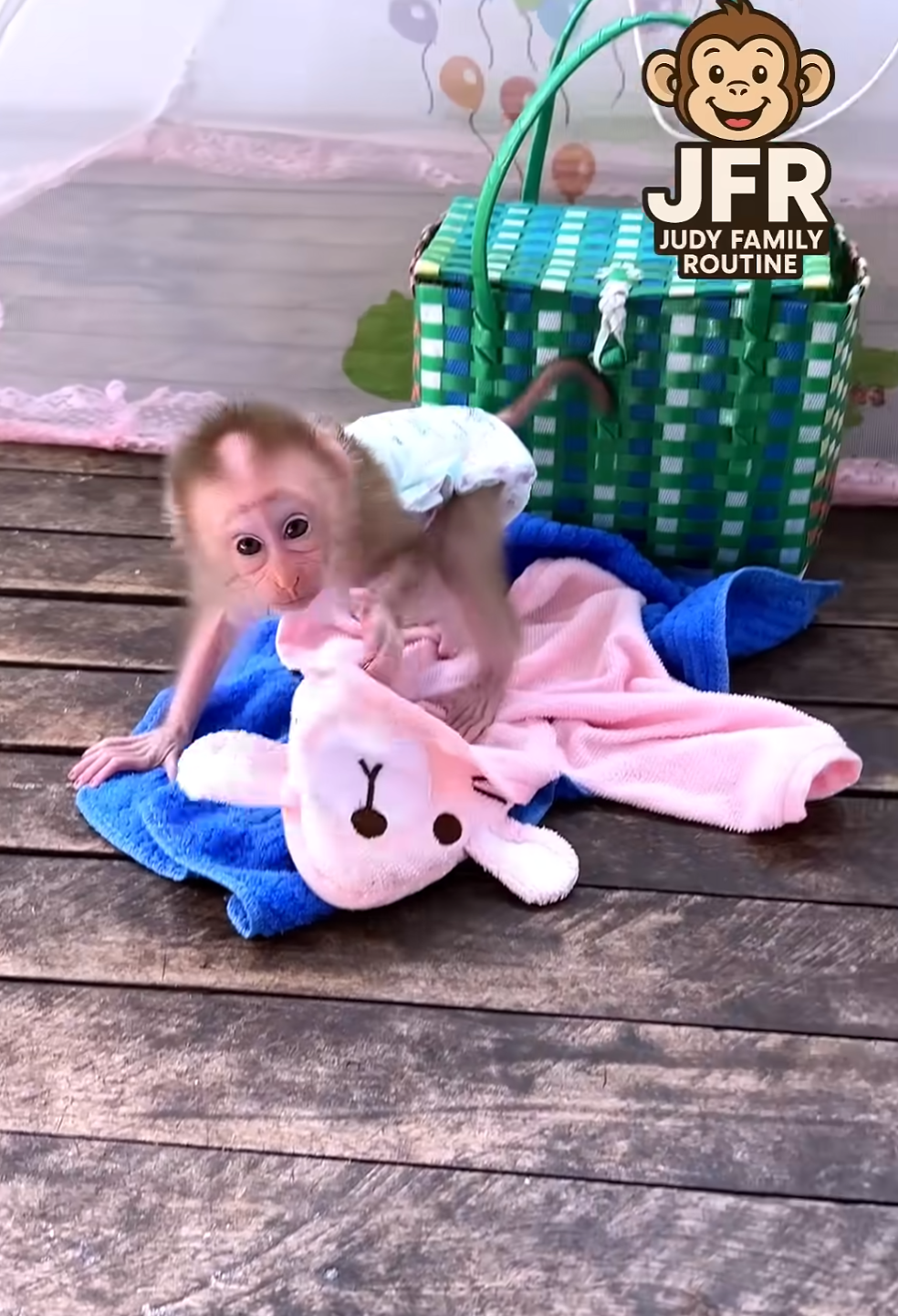 Mama Lala stroked Susu’s fur gently, using her fingers to smooth it, clean it, and remove anything tangled. She knew baby monkeys had delicate skin, so she was always careful not to pull or rub too hard.