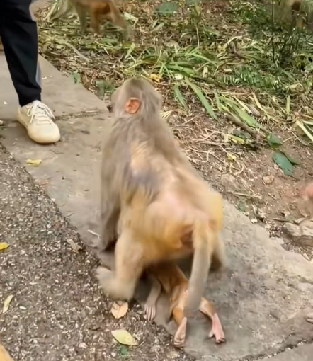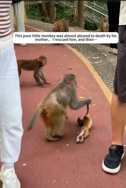 A little monkey lay curled on the ground, his tiny body trembling like a wilted leaf about to fall. His fur was patchy, his arms thin, and his eyes half-closed as if he no longer had the strength to keep them open. But the most heartbreaking detail was the bruising around his back and neck—clear signs that he had been roughly bitten, scratched, and dragged. His breaths were faint, shallow, the kind that told me he didn’t have much time left.