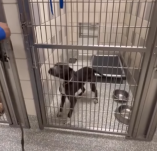 The team moved slowly. “Hey, sweetheart… it’s okay,” one of them whispered as she knelt beside the cage. She reached her hand through the bars, her fingers brushing the edge of his paw—cold, thin, and shaking. The dog did not pull away. He didn’t even seem to have the strength to react.
