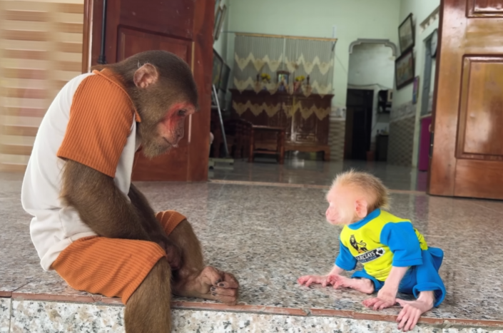 The afternoon sun made the house warm and peaceful. CUTIS brought a small pillow for Mom’s back, and the baby monkey brought a tiny leaf—his version of a pillow, apparently. He placed it beside hers, patting it gently.