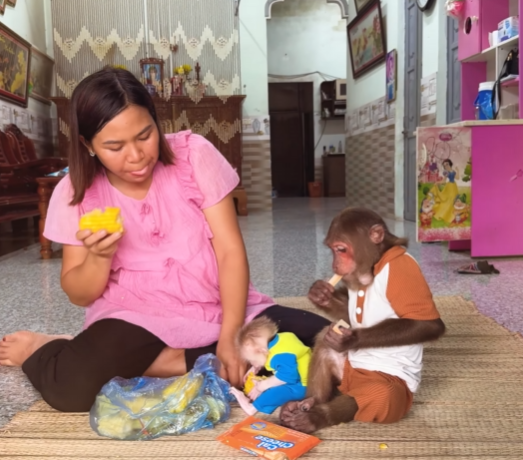 Mom stroked them both—her son on one side, the little monkey on the other.