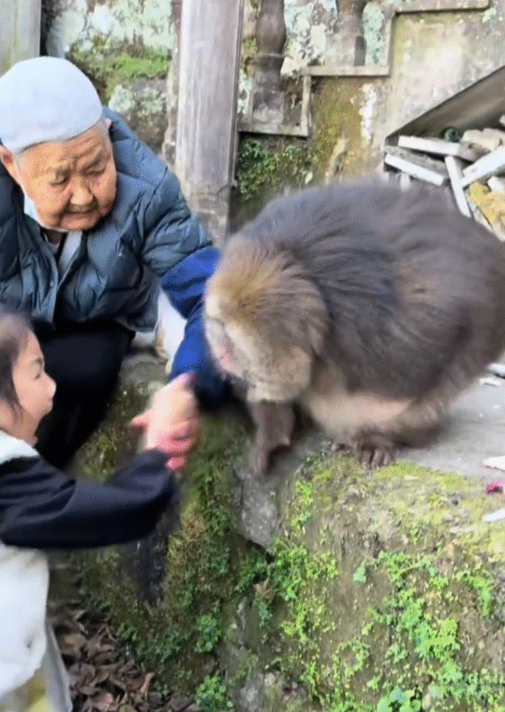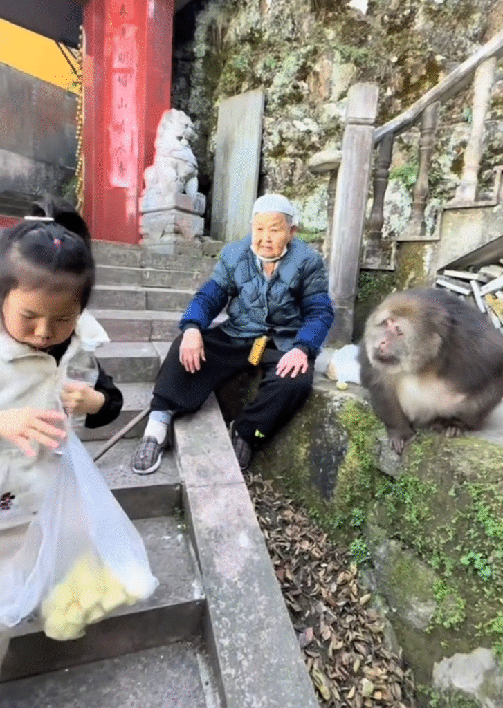 Xingxing let out a soft sound—a gentle chirp that monkeys make when they’re unsure but trying to be friendly. Then he took a small bite of the banana, glancing back at her as if to say thank you.