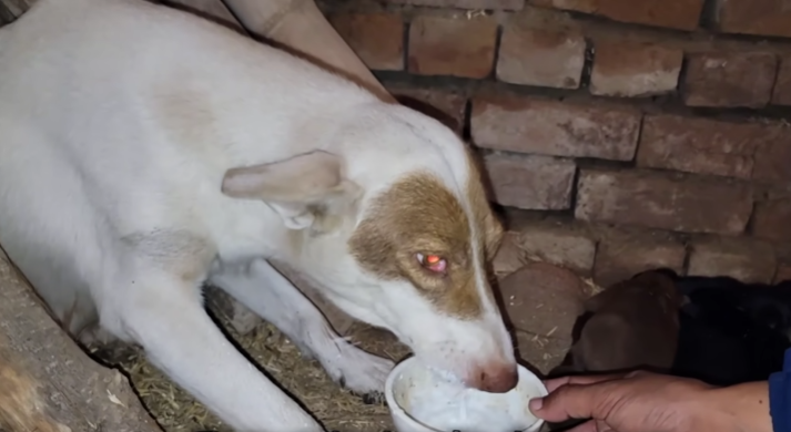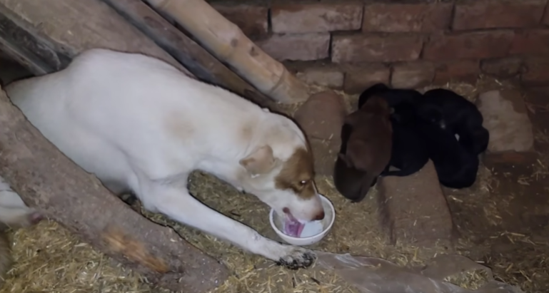 When food was placed in front of her, she didn’t eat right away. She nudged her puppies closer, licking them softly, and only when they settled did she finally take her first cautious bite.