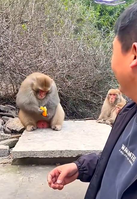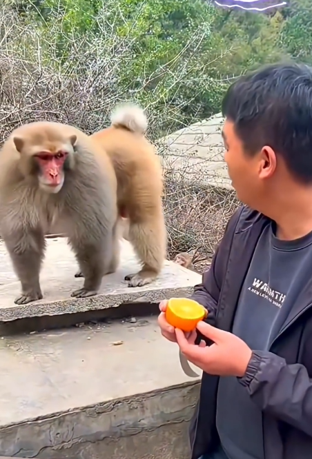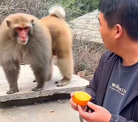 Most monkeys would have ignored her, taking the fruit for themselves. But not Kiko. He tilted his head, observing her quietly. Then, in a gesture that melted the hearts of everyone watching, he picked up a small orange and held it carefully in his hands.