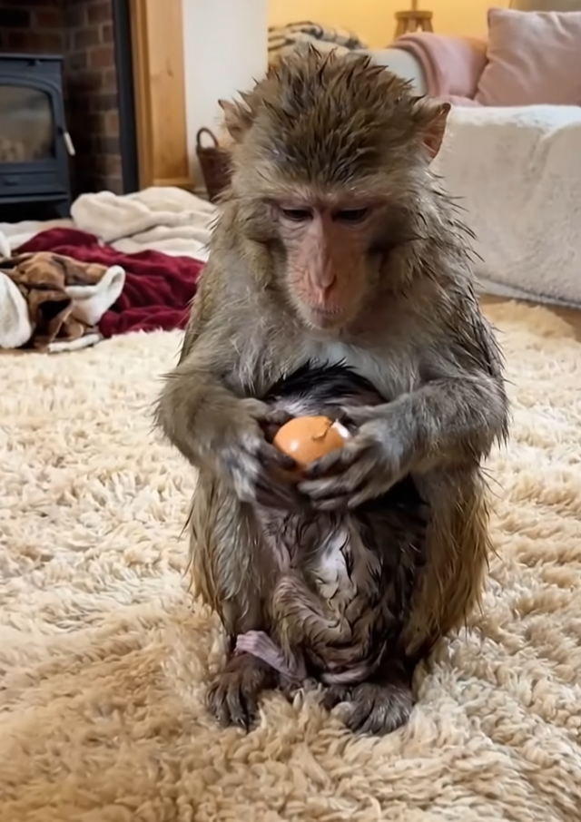 Lala shook the water off her fur, then gently sat with Titi in the corner. The baby immediately clung to her, warming up in the dry air. Dara placed a small bowl of fruit—bananas, mango slices, and jackfruit—close by, then stepped back to give them space.