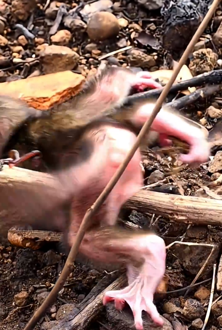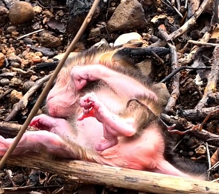 From the very first frame, it’s clear that this tiny creature is fighting against every limitation of its newborn body. Newborn monkeys, like most primates, are dependent on their mothers for warmth, protection, and guidance. They cannot walk, climb, or forage on their own. Yet, in this moment, the baby monkey is showing something extraordinary: an instinctive will to survive.
