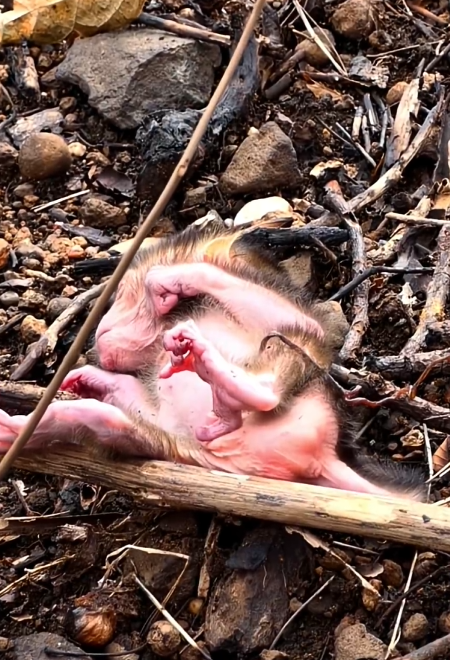 The video opens with a wide shot of the forest floor, littered with leaves, twigs, and patches of soft sunlight. In the middle lies the tiny baby monkey, its fur still damp and clinging to its fragile body. The newborn’s eyes are half-open, blinking against the bright sunlight. Each movement is a monumental effort. Its little arms tremble as it tries to lift its body, and its legs, still uncoordinated and weak, buckle under the smallest strain.