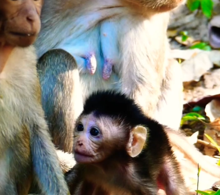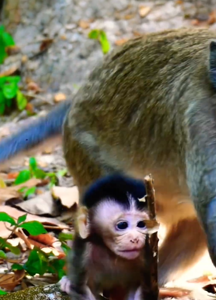 Little Nino, a baby monkey barely old enough to swing properly from branches, clung to a low tree trunk with all his strength. His big, sparkling eyes were fixed on his mother, Mara, who was gracefully leaping from branch to branch ahead of him. Her tail swayed elegantly, and her movements were confident, fluid, and swift. Nino’s little arms stretched desperately as he tried to keep up, but his short legs couldn’t match her speed.