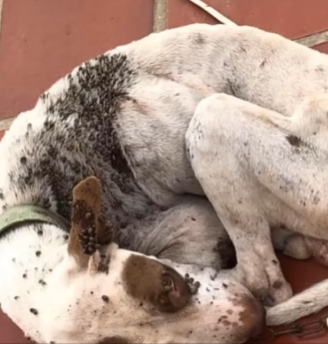 A dog—small, frail, and covered entirely in ticks—lay chained to a metal stake driven into the ground. His body barely moved. Only his eyes flickered faintly at the sight of her.
