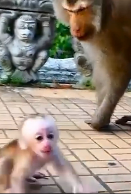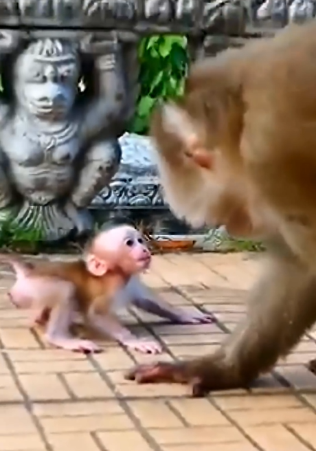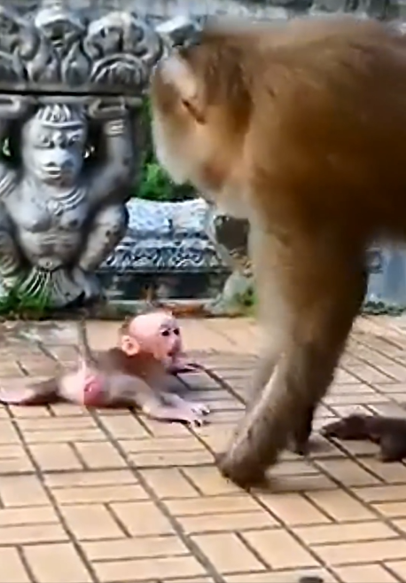 Garo saw the small figure moving near the branch and immediately interpreted it as a challenge. Not malicious in intention, but firm in enforcement, Garo approached Kimo with a low growl. Kimo froze, sensing danger, but curiosity still lingered in his wide eyes. Before he could retreat, Garo delivered a swift, sharp strike to the baby’s tiny body—a warning, a reminder of the hierarchy that governed their world.