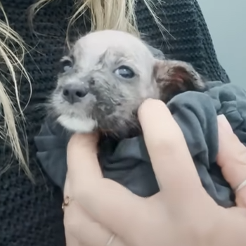 The puppy barely lifted his head when she knelt down. His eyes were dull with exhaustion, but they flickered when she spoke softly. Lina immediately slipped off her scarf and wrapped it gently around his tiny body.