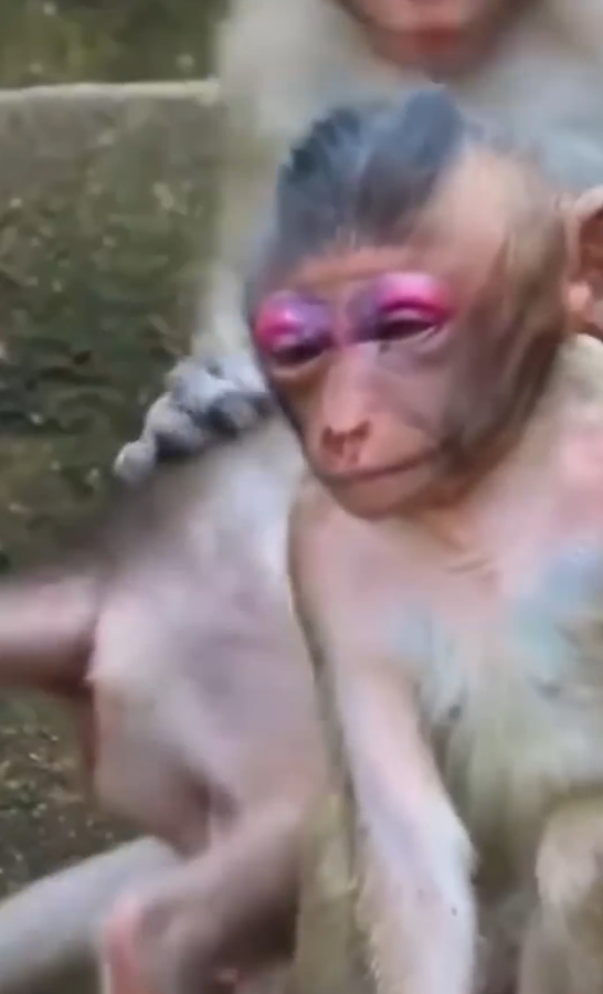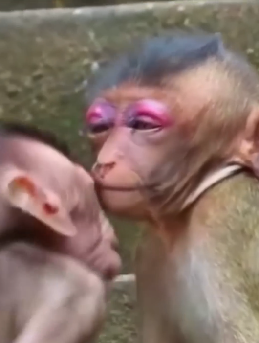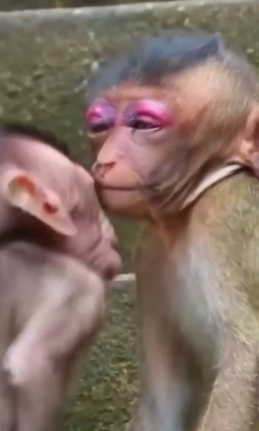 The bees, sensing danger to their hive, swarmed. Mimi squealed as they stung her tiny face. She leapt back in panic, rubbing her cheeks with her little hands. Within minutes, her face began to swell. Her eyes looked like small slits, and her cheeks puffed out comically, making her expression both pitiful and funny at the same time.