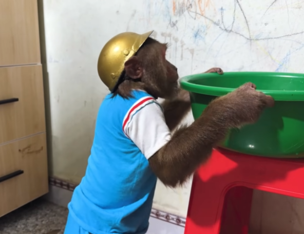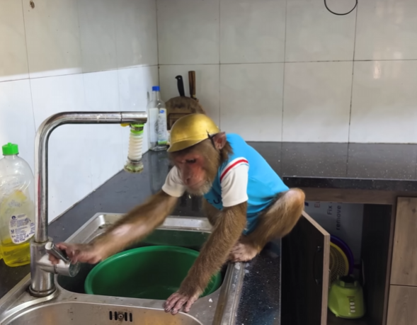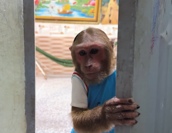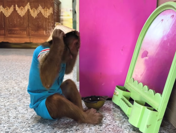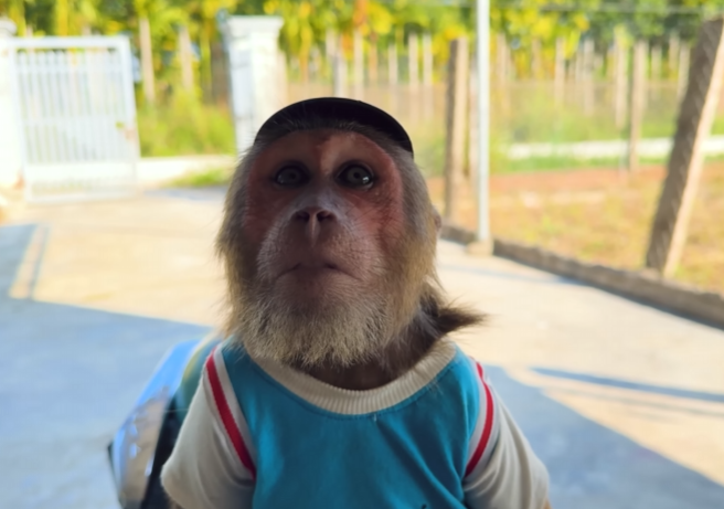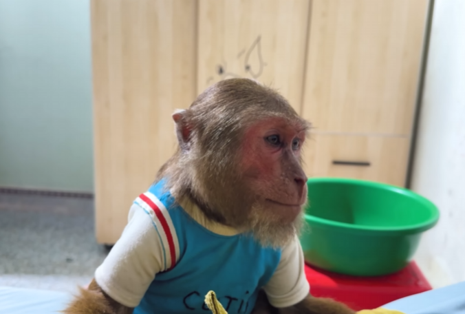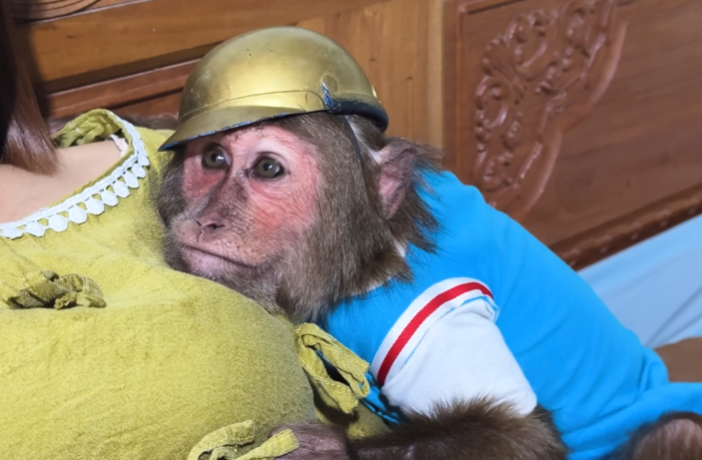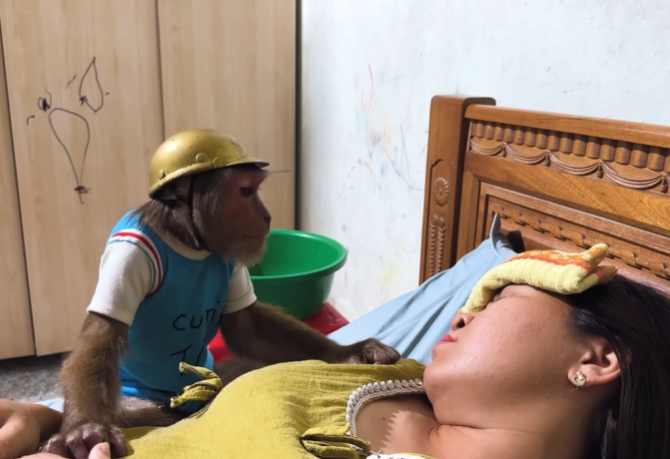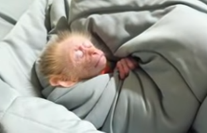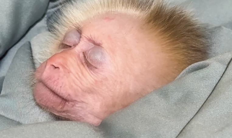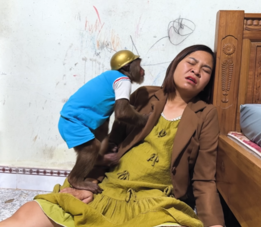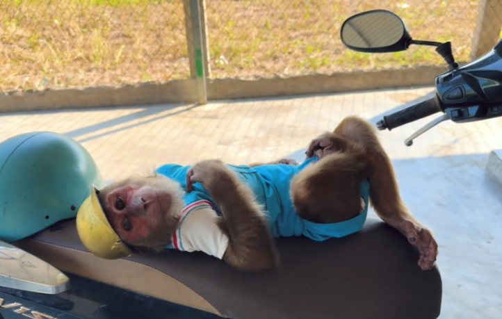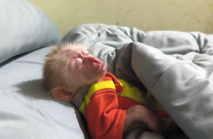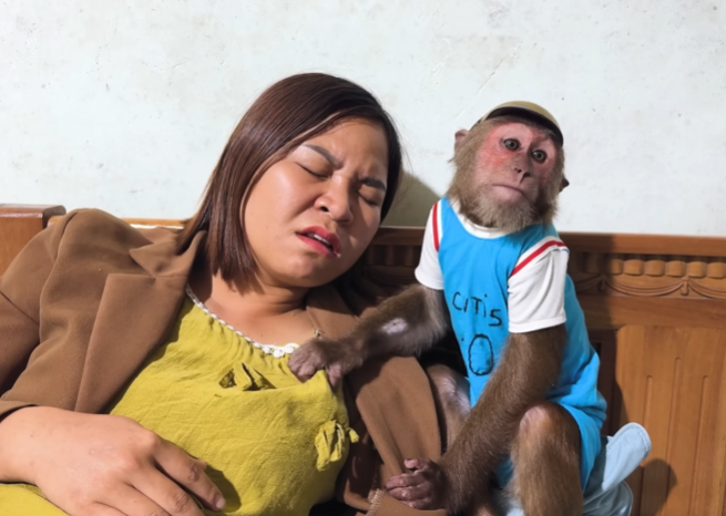 Nearby, the baby monkey—small, curious, and full of innocent energy—noticed the stillness. Usually playful and restless, the baby now sat quietly, watching Mom sleep.