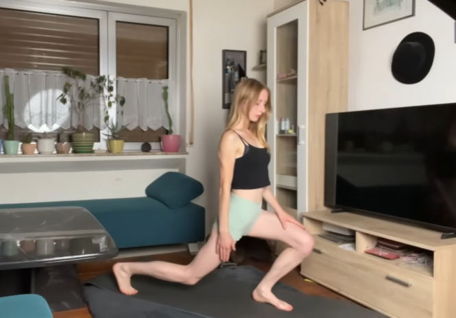 Next, the practice transitions into hip-focused stretches, essential for any type of riding. Hip circles loosen the joints, improving range of motion and comfort in the saddle. Lunges follow, opening the hip flexors that often become tight from sitting. As the pelvis sinks forward, the chest stays lifted, creating space through the front of the body. These stretches help prevent lower back strain and promote a more stable riding position.