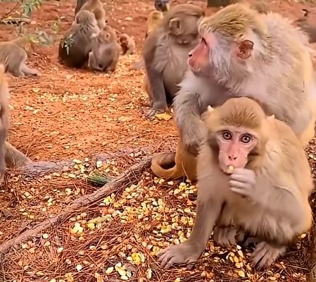 One by one, the other monkeys approached. Mothers carrying babies in their arms carefully extended a paw to accept peanuts, while infants clung to their parents, watching the strange human gift with wide, fascinated eyes. A small chaos began to form, but it was a controlled chaos: monkeys grabbing peanuts, cracking shells, and tossing the nuts to each other in playful gestures.