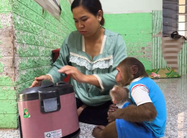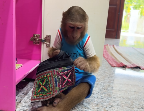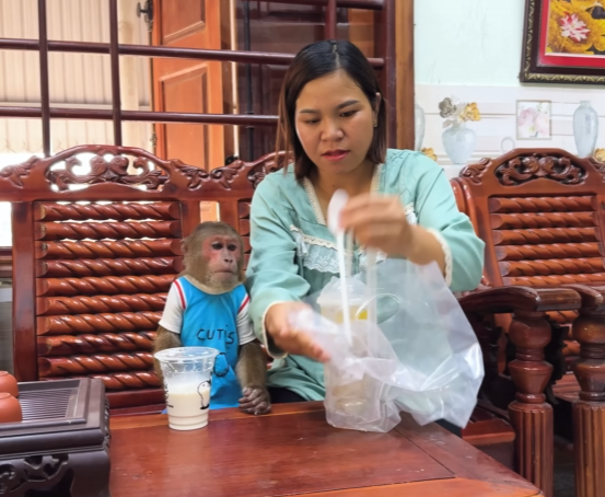 The baby monkey climbed onto Mom’s shoulder and proudly presented the lipstick.