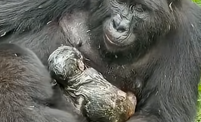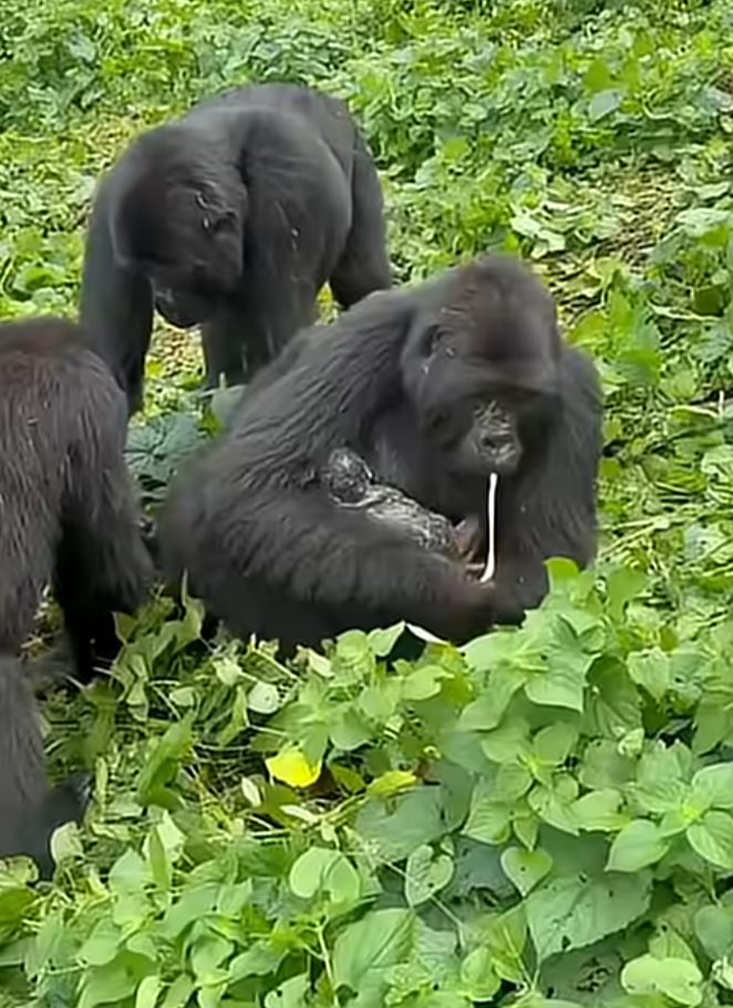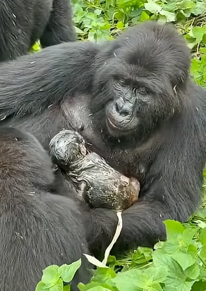One of the first tasks the mother performs is tending to the umbilical cord. This is a normal and important part of birth for many mammals, including gorillas. With calm precision, she removes the cord in a natural, nonviolent way, ensuring her baby can begin life independently. There is no rush, no panic—only patience and care. This moment shows how deeply connected gorilla mothers are to their babies and how capable they are at caring for them from the very first breath.