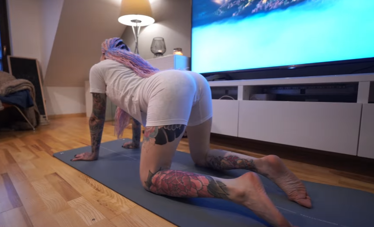 Moving onto hands and knees, Roxy introduces the classic Cat–Cow pose.