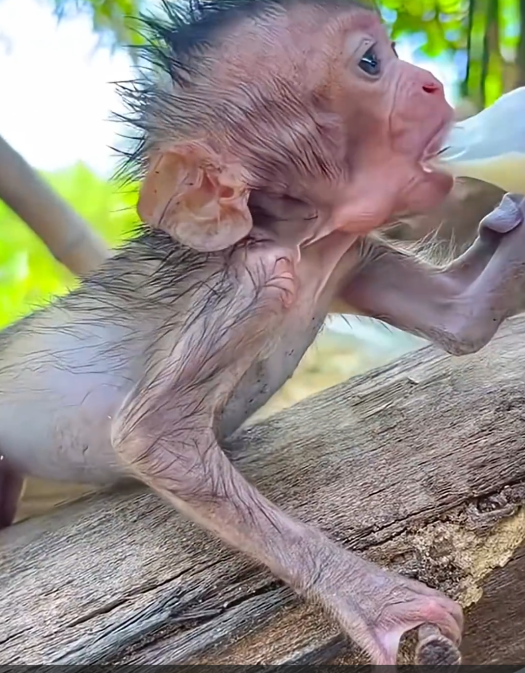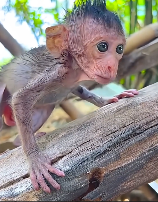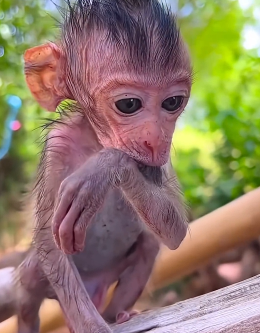 In the heart of a lush, sprawling jungle, where sunlight filtered through thick green canopies and the air was alive with the songs of birds, a tiny baby monkey clung to the branches of a tall tree. His fur was matted, and his eyes, wide and glistening, reflected a mix of fear and hunger. He was barely a few weeks old, and yet, the world around him seemed both enormous and merciless. Every rustle in the leaves, every shadow, reminded him of his fragile existence.