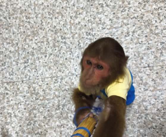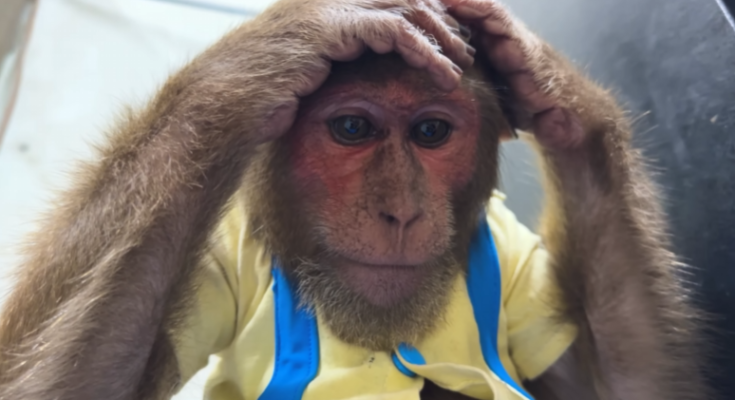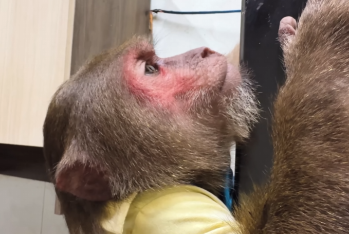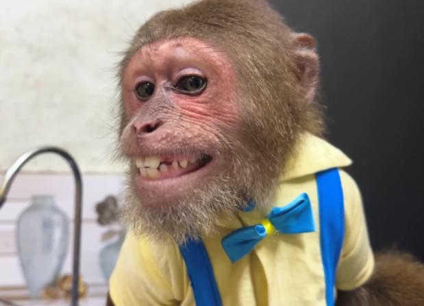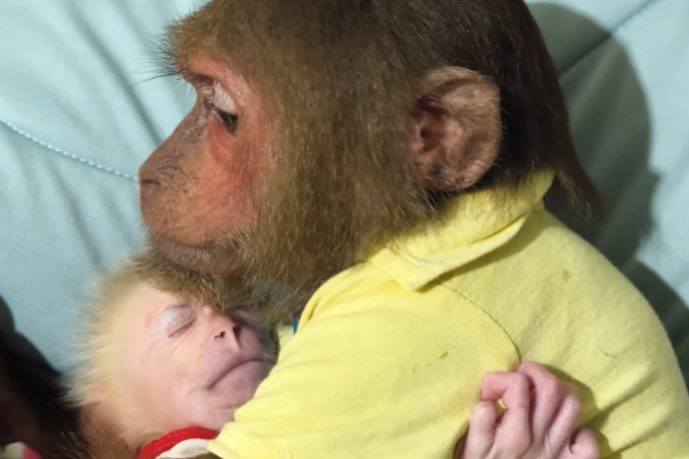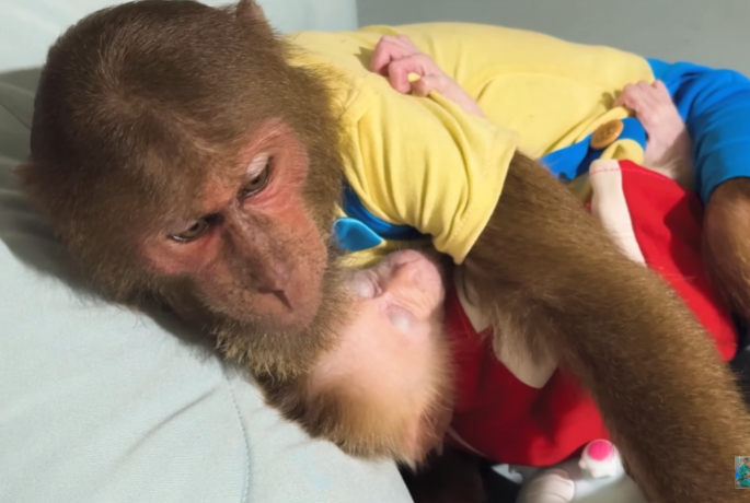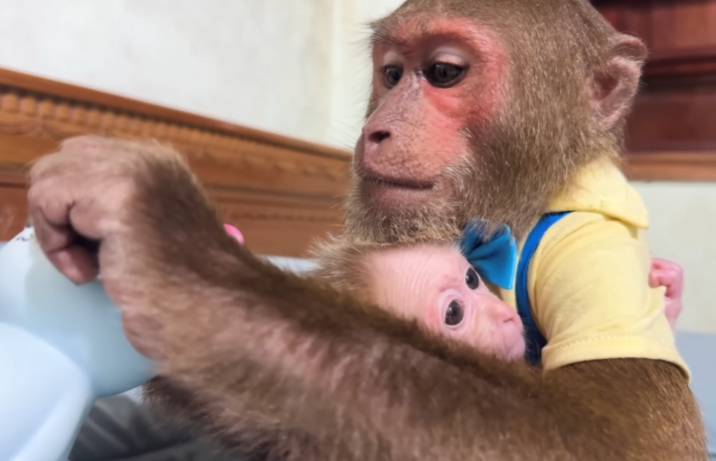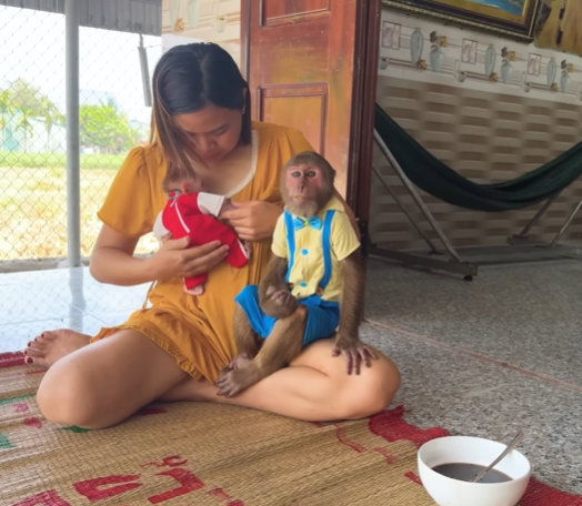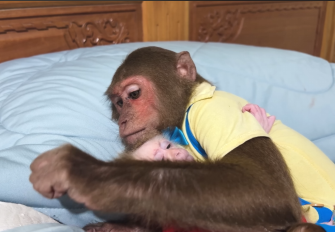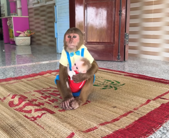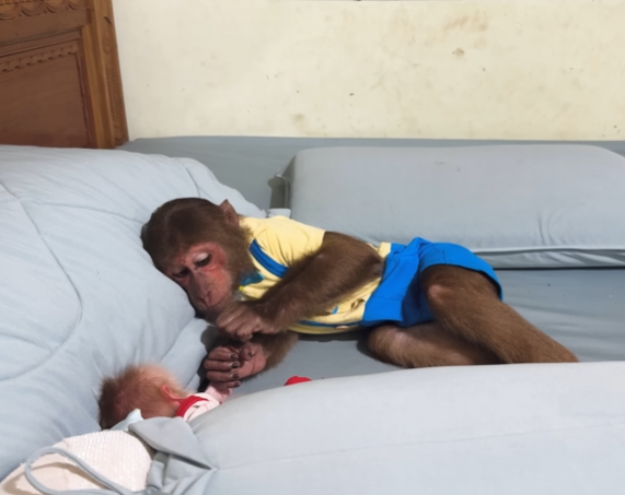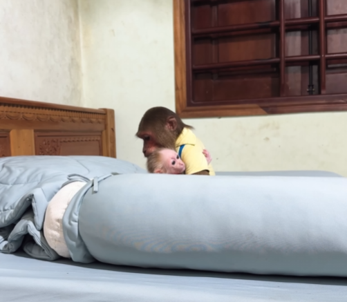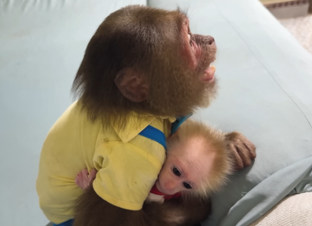 CUTIS froze, then slowly shook his head, stepped back, and sat down beside Diven instead. He wrapped an arm around the baby monkey protectively, choosing peace—for once.