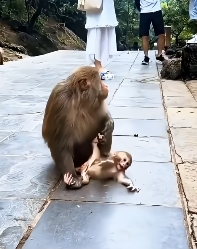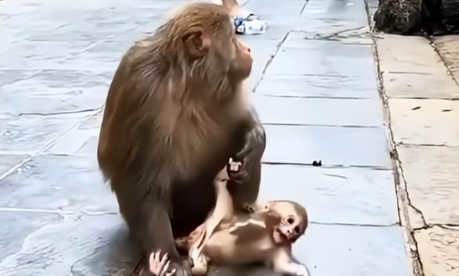Dara followed the sound carefully, moving slowly so he wouldn’t scare anyone. Through the leaves, he saw a mother monkey perched low on a branch. In her arms was a tiny baby—far too small to cling properly, its hands trembling as it tried to hold on. The mother looked stressed and restless. She shifted sharply, pushing the baby away again and again. Each time the baby tried to return, it cried louder.