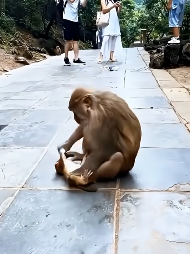 Slowly and carefully, Dara approached. The tiny monkey lay curled on the ground, shivering and exhausted. Its eyes were wide, searching for comfort that wasn’t coming. Dara knelt and spoke softly, not reaching out right away. He knew sudden movements could frighten a wild animal. When the baby tried to crawl toward him, he gently wrapped it in his scarf, lifting it with the care of someone holding something precious.