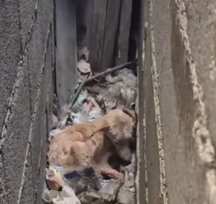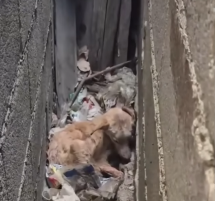 I stepped closer, my shoes crunching over the trash. The space between the buildings was narrow and damp, filled with the smell of mildew and old rainwater. And there, pressed against the wall as if trying to become invisible, was a small dog. Her fur was matted and dirty, speckled with bits of food and wet paper. One ear drooped lower than the other, and her body trembled so hard I could see it even in the dim light.