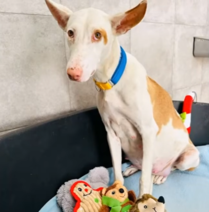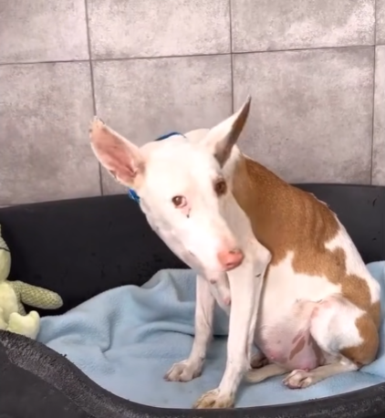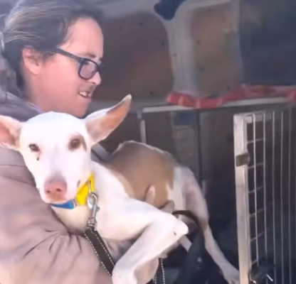 I took her home that night. I set up a warm corner with blankets and pillows, food and clean water. She ate carefully, pausing often, as if afraid the meal might disappear. When she finished, she walked over to me and rested her head on my knee, sighing deeply. It was the first sound of relief she had made.