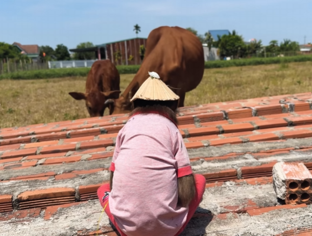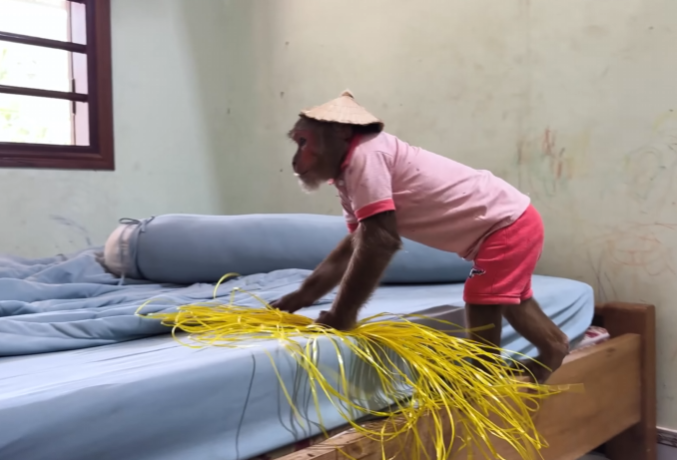 Back at the farm, CUTIS didn’t cage the baby monkey. Instead, he built something extraordinary: a small “forest corner” beside his house. Using bamboo, rope, and old cloth, he created climbing poles, soft nests, and shaded resting spots—just like the monkey’s natural home.