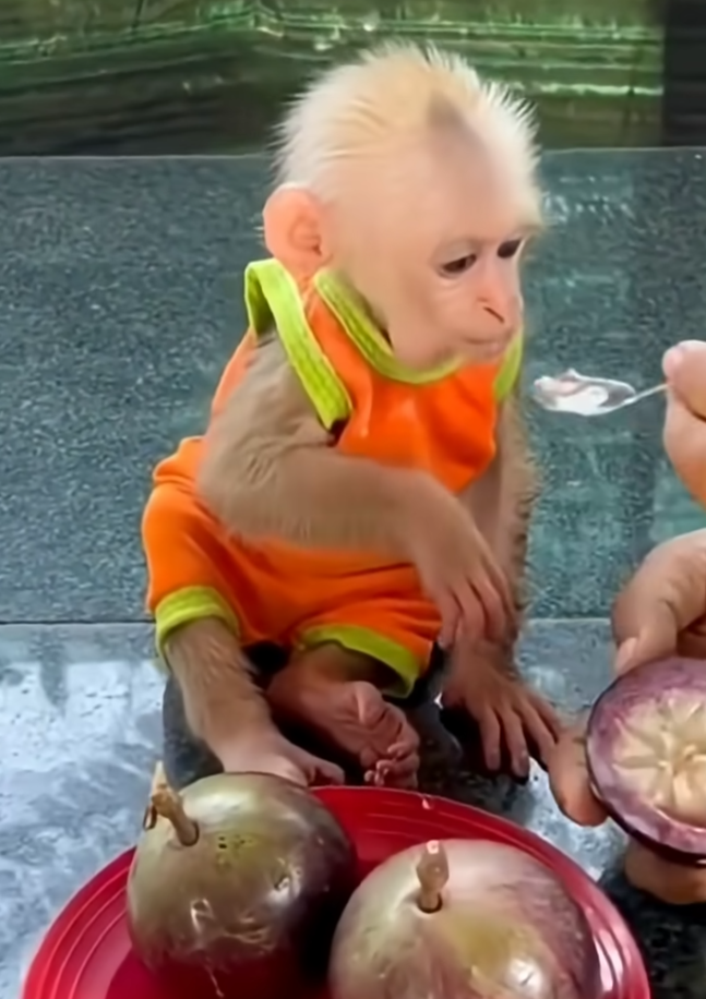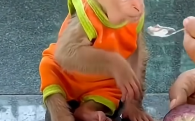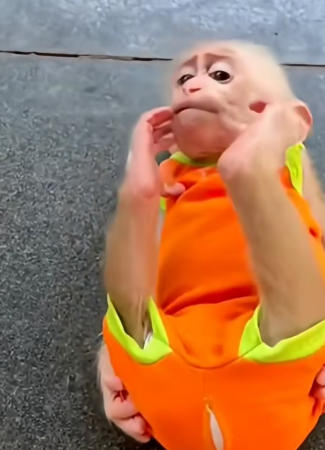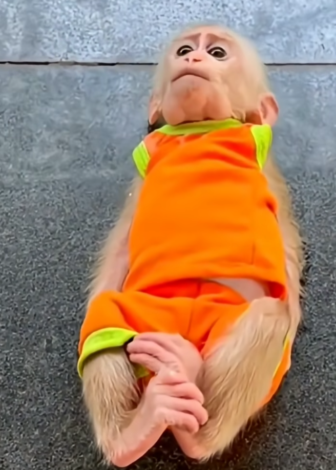 The little bab monkey didn’t want to sit—not on the warm stone, not on the soft leaves, not even on the gentle lap offered by the people who cared for him. From the moment the sun climbed above the trees, he was already wriggling, stretching, hopping from one place to another like a spark that refused to stay still. His tiny hands grabbed at air, at vines, at curiosity itself, and his bright eyes shone with a mix of wonder and restlessness.