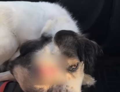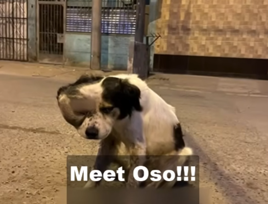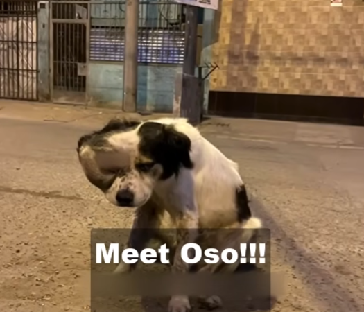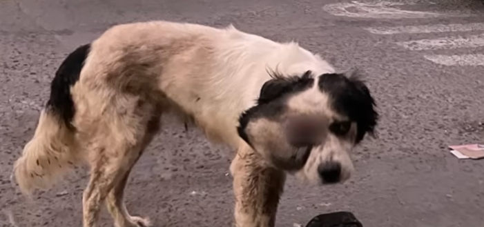 He was a dog—thin, sandy-colored, with ribs like a ladder beneath his fur. His tail wagged when someone looked at him, even if that look was filled with disgust. He had learned to beg quietly. He did not bark or snarl. He simply sat a short distance away, head tilted awkwardly because of the weight on his face, eyes hopeful in a way that hurt to see.