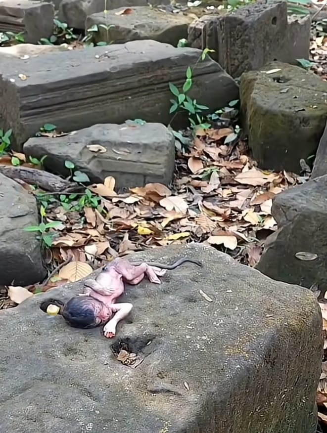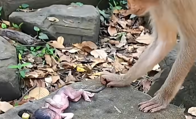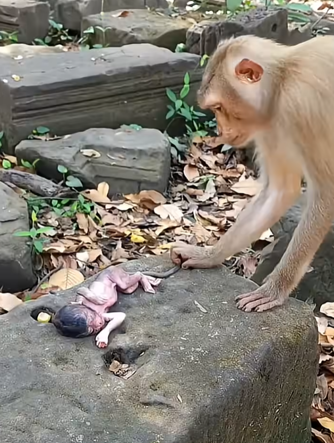 The forest was unusually quiet that morning, as if nature itself was holding its breath. Sunlight filtered softly through the tall trees, landing gently on a flat stone warmed by the day before. Upon that stone lay a tiny newborn monkey, fragile and new to the world. Close by stood his mother, her eyes filled with focus, care, and a deep instinct older than the forest itself. This was the moment of her first touch—a moment that would shape her baby’s life forever.
