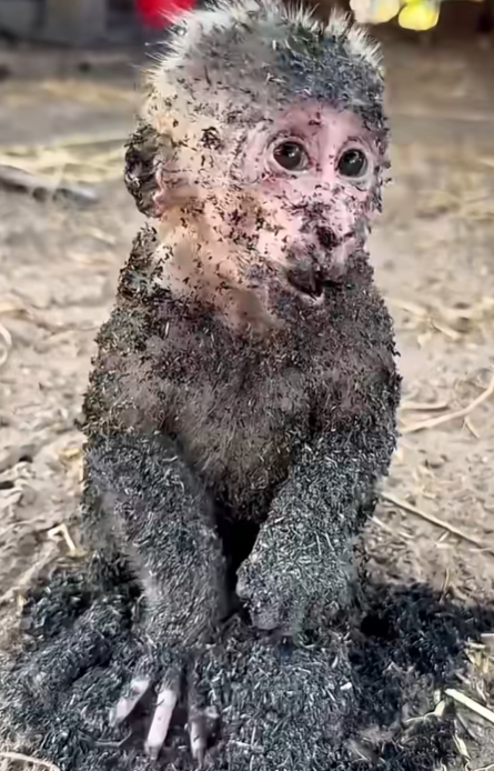One of the rescuers extended a gloved hand, and after several tense moments, the monkey allowed itself to be scooped up. Safe in the human arms for the first time in hours—or maybe days—it clung tightly, as if sensing that survival depended on trust. The rescuers immediately wrapped it in a soft blanket and examined it for injuries. Its tiny body was bruised, and its fur was tangled, but thankfully, nothing appeared broken. Still, the little monkey’s eyes told a story of trauma, confusion, and fear.
