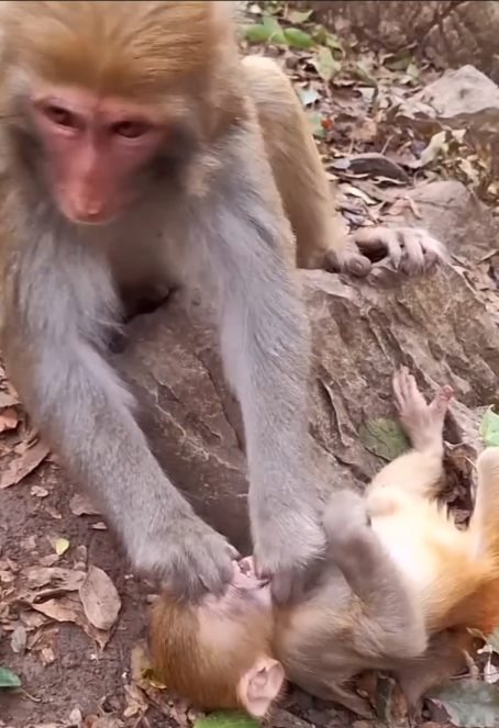 “Can a monkey really do this to its child?” one might think. But this act, as shocking as it looked, was a form of discipline. In the wild, monkey mothers often use physical gestures—not to harm, but to correct behavior, teach boundaries, and ensure survival. Unlike human parents, they cannot explain danger in words. A sharp motion, a firm grip, or a sudden move is their way of communicating: “Stop! That is dangerous. Pay attention!”