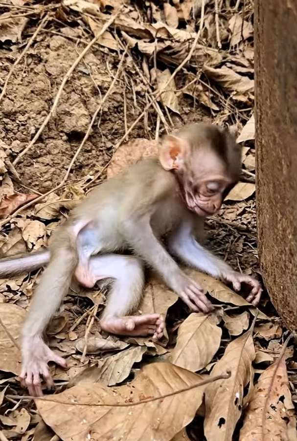 The forest was unusually quiet that morning. Sunlight filtered through the tall trees in soft, golden lines, touching leaves still wet with dew. Birds watched from branches above as a small figure lay curled near the roots of an old fig tree. He was a baby monkey, tiny and trembling, his fur dusty and thin. One of his little hands rested awkwardly against his chest, fingers bent in a way that did not look right. Beside him lay his mother, still and silent, her warmth already fading.