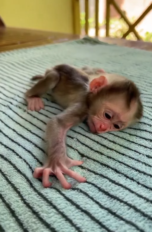 In the days that followed, the baby monkey learned a new routine. He was wrapped in soft cloths to keep him warm. He was fed small amounts, often, until his body regained strength. At night, he slept curled around a stuffed toy placed beside him to mimic the comfort of his mother’s presence. Sometimes he whimpered in his sleep, reaching out with his uninjured hand, searching for something familiar.