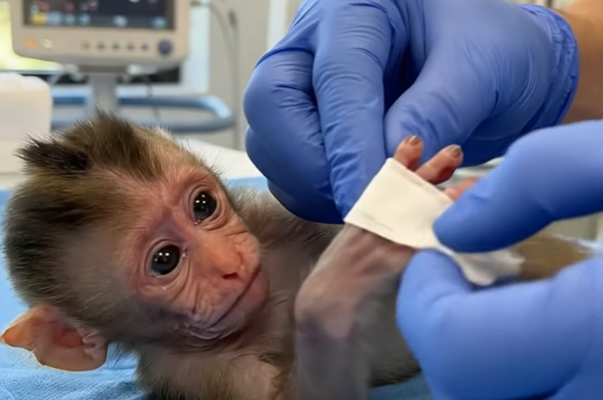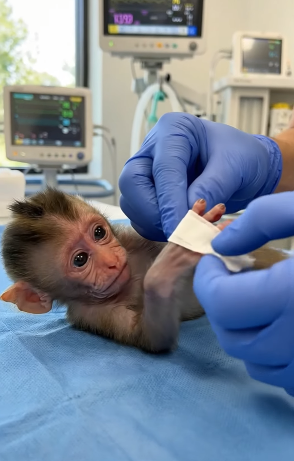 The journey out of the forest was quiet. The baby monkey barely moved, his breathing shallow and fast. Every bump made him flinch, and he kept his injured hand tucked close, as if protecting it from the world. At a nearby wildlife care center, trained hands waited. They examined him slowly, carefully, making sure he felt safe. The broken fingers were treated as gently as possible. There was no rush, no harshness—only steady care.