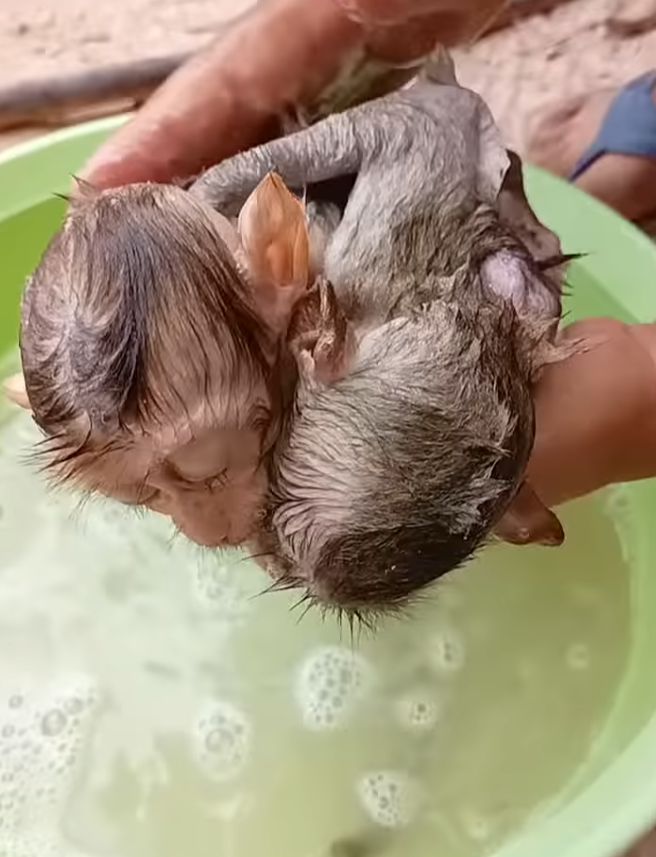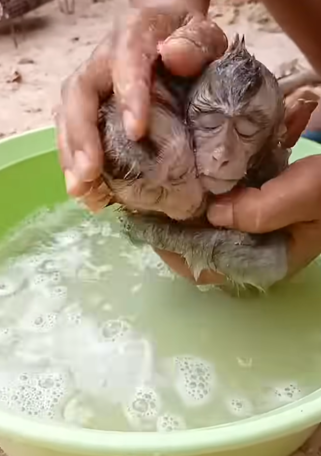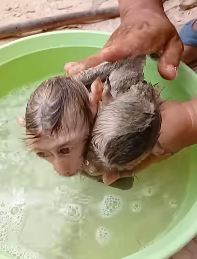 Coco was the braver one, at least on the outside. He tilted his head, tapped the basin with one finger, and squeaked softly as if asking a question. Bebe, smaller and rounder, clung to Dad’s pant leg, hiding half his face but peeking out with bright, curious eyes. The two had been playing since sunrise—rolling in fallen leaves, splashing in a muddy puddle, and climbing the low branches near the fence. By the time afternoon arrived, they were full by dirty from head to tail.