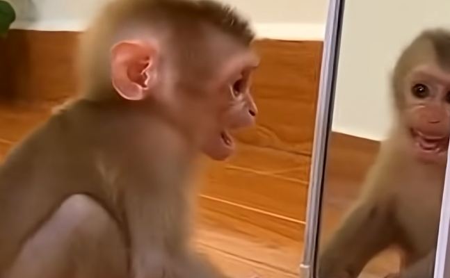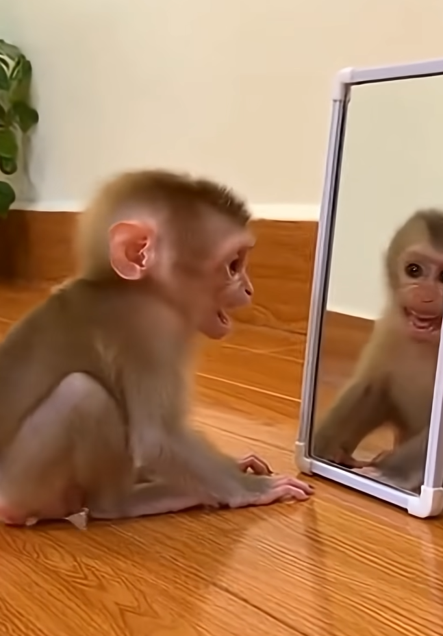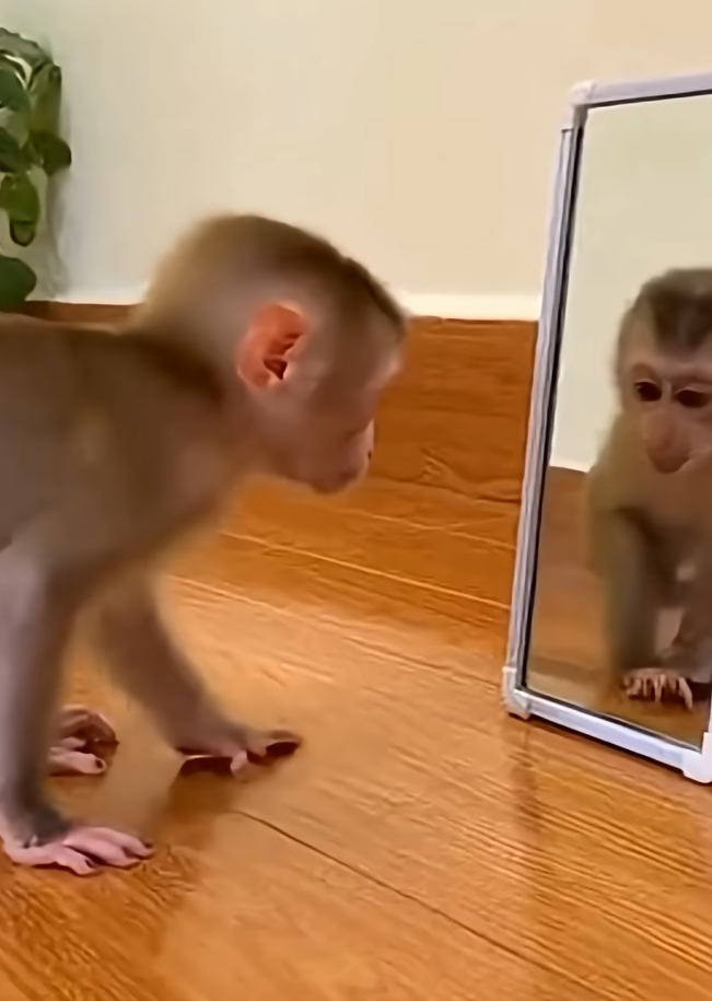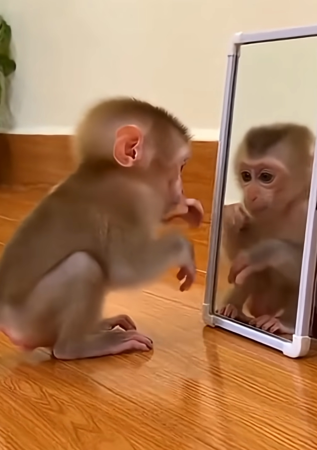 One morning in the forest, a young monkey named Milo discovered his reflection in a shiny metal bowl left by campers. At first, he stared at it with wide eyes, tilting his head left and right. The reflection copied him perfectly, which clearly offended Miloâs sense of uniqueness. He puffed out his cheeks, raised his eyebrows, and even stuck out his tongue. When the âother monkeyâ did the same, Milo squeaked in surprise and jumped backward, landing in a pile of leaves. He popped up, leaves stuck to his fur like confetti, and looked around as if pretending nothing had happened. The audienceâhis troopâchattered loudly, clearly enjoying the show.
