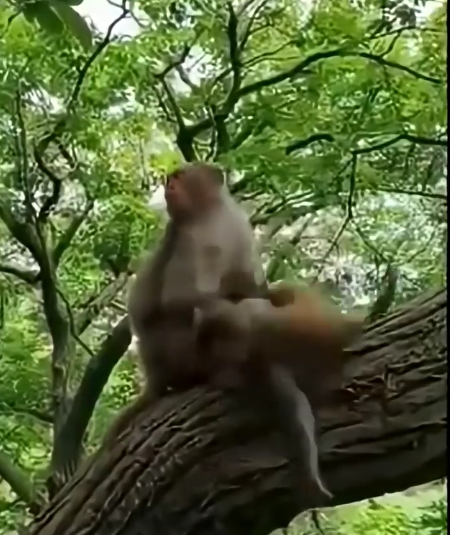 But life in the forest is rarely without risk. In a brief lapse—perhaps a slip of the tiny hand or a sudden movement—the baby monkey loses balance. Its tiny body topples, falling from the secure grasp of the mother. Time seems to slow as observers—both human and troop members—watch with alarm. The newborn, completely defenseless, descends toward a lower branch, its cry a sharp, piercing sound that cuts through the forest’s usual chatter.