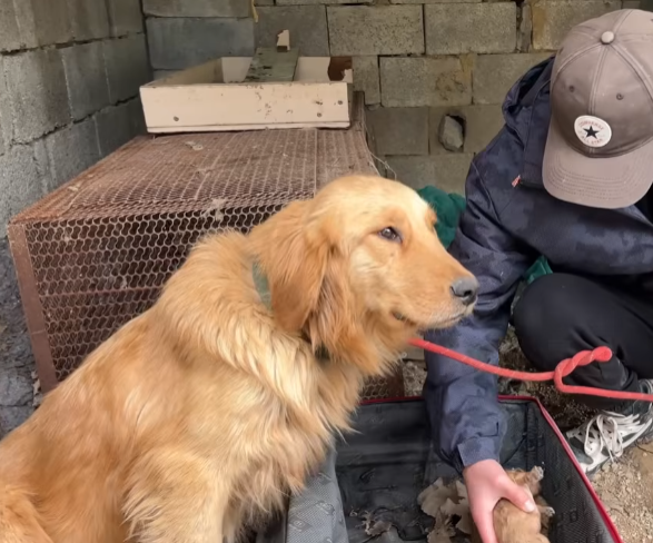 The person who discovered her had come to check on the chickens but froze when they heard a soft whimper. Peering inside, they saw the golden retriever wrapped around her puppies, her fur matted with dirt and straw. The smell of cold earth and damp wood filled the air. It was immediately clear that if help did not come quickly, the outcome could be tragic.