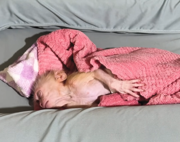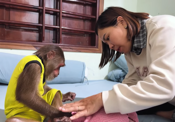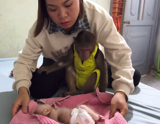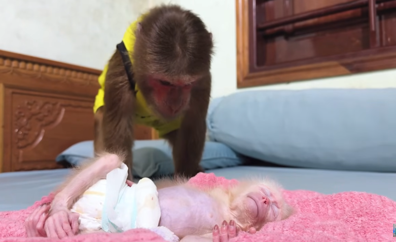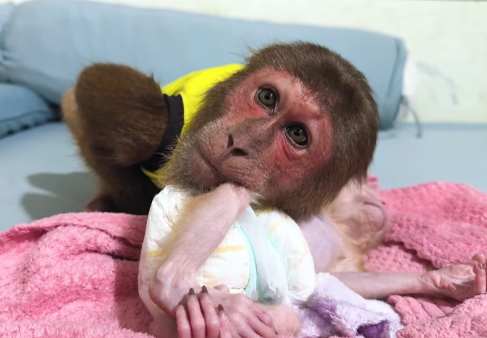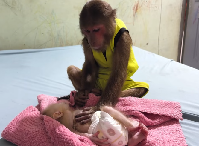 Newborn baby monkeys are fragile, just like human babies. They cry easily, sleep often, and sometimes struggle with the simplest things—especially digestion. This little baby had been restless all night. It wriggled, whimpered softly, and curled its tiny body in discomfort. The mother monkey looked exhausted, gently rocking back and forth, unsure how to help. That was when Cutis stepped in.