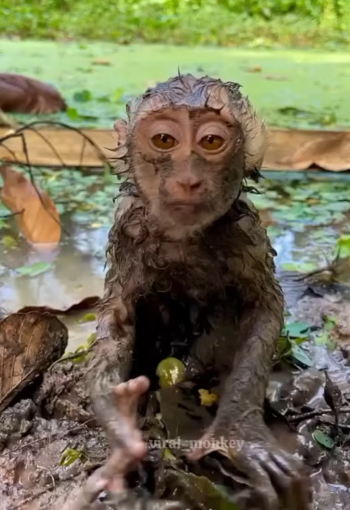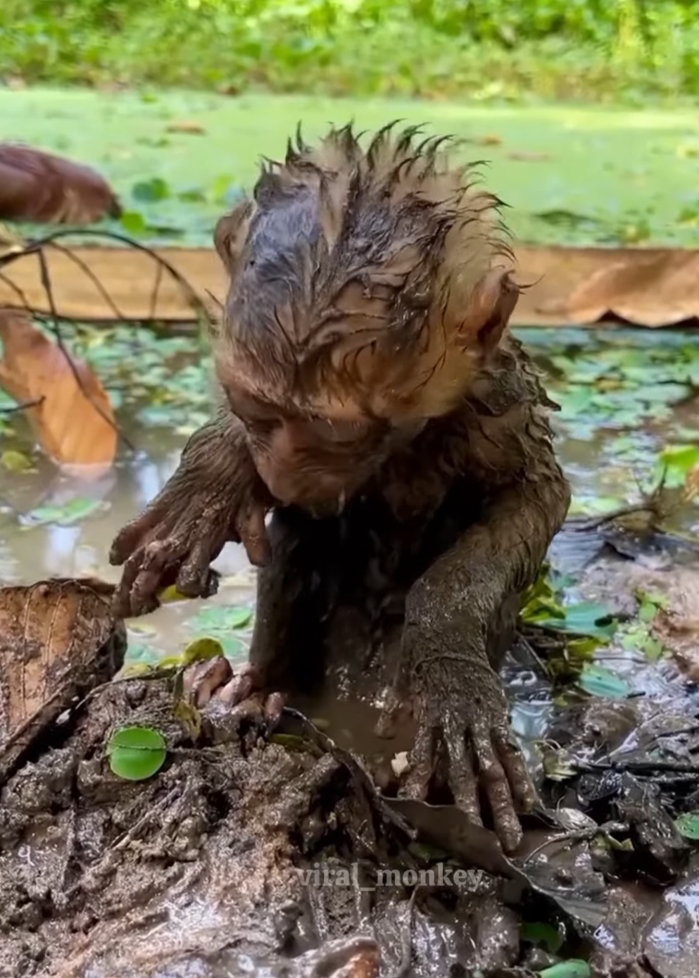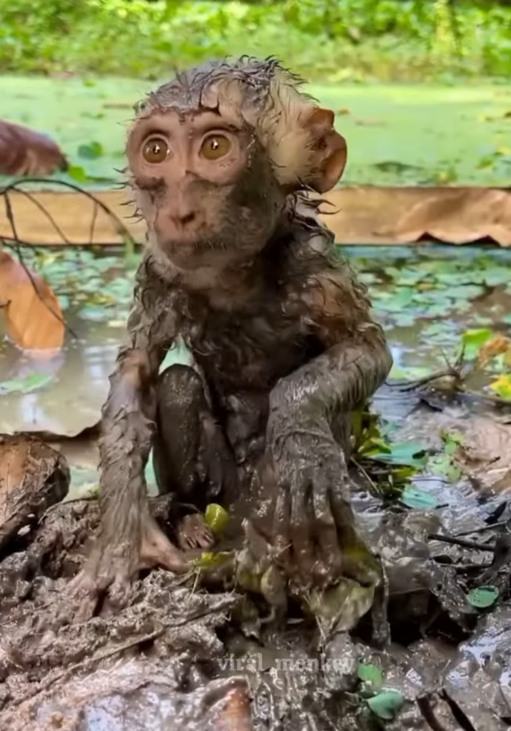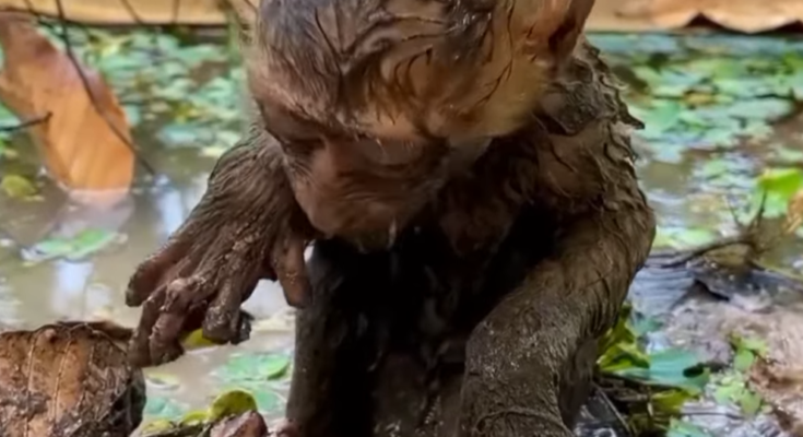 At first, the baby monkey squeaked softly, calling out in a thin, shaky voice. It looked toward the trees, searching for the familiar shape of its mother. But the forest answered only with rustling leaves. Each passing second felt heavier than the last. The mud was cold and smelled of wet earth, clinging to the baby’s fur and weighing it down. Its small chest rose and fell quickly as fear took over.