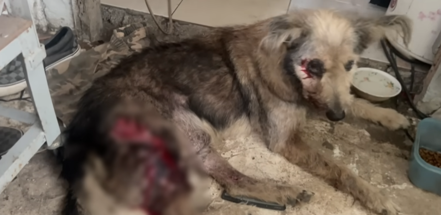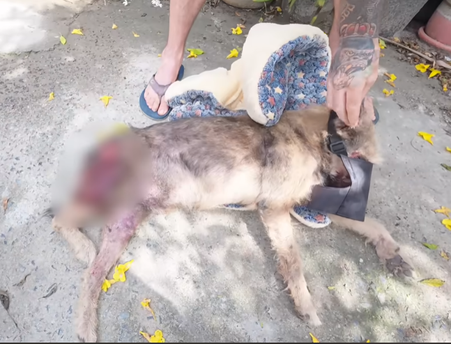 He lay on his side in the dirt, ribs rising sharply beneath skin stretched too tightly across his body. His fur was matted, stained with blood and mud. One eye was swollen shut, the other half-open, dull but still aware. His breathing was shallow and uneven, each breath sounding like a question mark hanging in the air. Was he holding on—or already letting go?