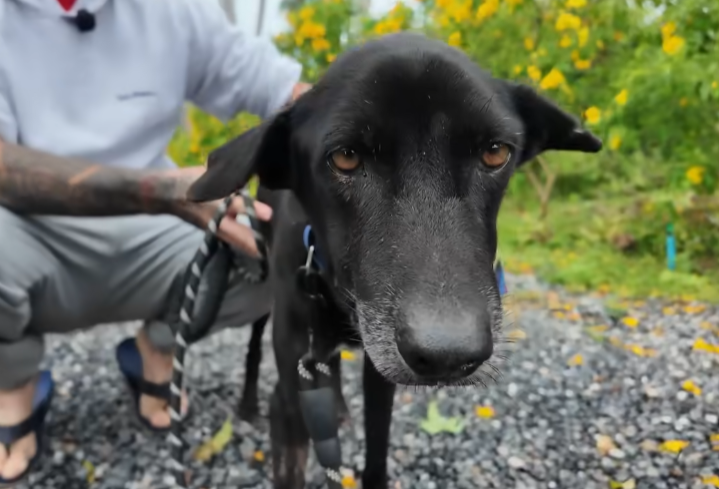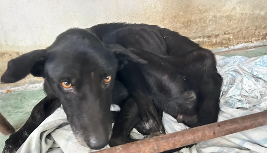 He lay near a small food stall that had already closed for the day. The smell of old rice and soup lingered in the air, but he did not have the strength to lift his head toward it. His legs were folded beneath him, awkward and stiff, as if moving them required more energy than he could spare. His eyes, large and sunken, followed us with a mixture of fear and quiet curiosity. He did not bark. He did not growl. He simply watched, waiting for whatever would happen next.