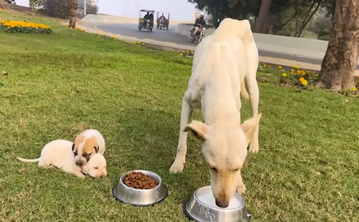 People noticed that the dog never ate from the trash bins he passed. He ignored food scraps tossed in his direction. Even when someone placed a bowl of water on the ground, he would drink quickly—but only after carefully setting the bag beside him and placing one paw protectively on top.